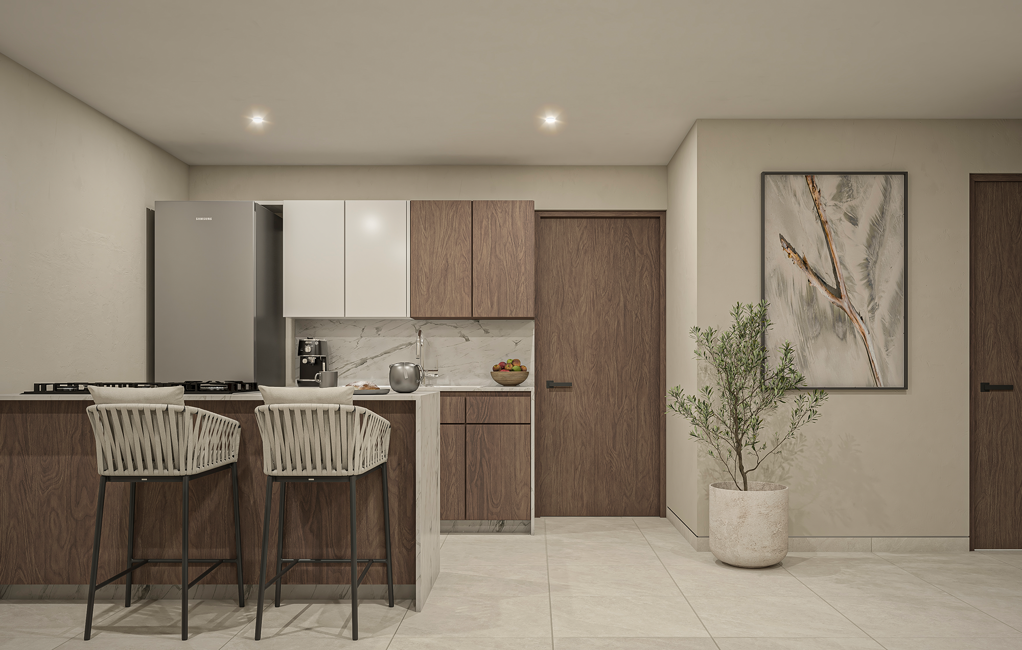 Un espacio funcional y bien integrado al área social, pensado para facilitar el día a día. Su distribución permite cocinar con comodidad y mantener una conexión natural con el resto del departamento, ideal para quienes disfrutan compartir mientras preparan sus alimentos.